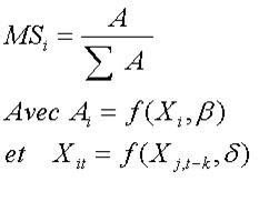 Cette fonction est relative à la part de marché de la marque i (MSi) qui est fonction de l’effort Ai qu’elle fournit au regard de l’effort fourni par l’ensemble de ses concurrents. Cet effort étant lui-même fonction des différents efforts fournis en termes de qualité de produit, de communication, de promotion, de marketing direct, de prix et de toutes les autres variables d’action Xit, et de leur efficacité relative beta. Ce modèle de base pouvant être complété par les fonctions de réaction, chaque action de l’un entraînant des réactions des autres(Xj, t-k). Il est peu de dire qu’une immense littérature s’est développée autour de cette équation fondamentale, et que celle-ci sans réduire toutes les facettes des problèmes à modéliser en est la matrice fondamentale.