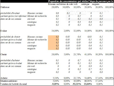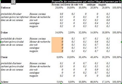 En multipliant la première ligne par le tableau en italique, on obtient la répartition des consommateurs entre les canaux utilisés pour l’évaluation.  Ces probabilités conditionnelles font que par exemple même si le canal de recherche est utilisé dans 30% des cas pour rechercher une information, il ne sera utilisé que dans 2% des cas pour évaluer les solutions.