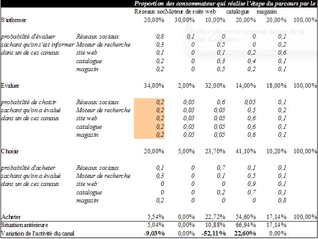 La première ligne donne la répartition des consommateur entre les canaux lorsqu’ils s’informent pour résoudre le besoin qu’ils éprouvent. La première matrice donne les probabilités conditionnelles qu’il évaluent les alternatives en fonction du canal utilisé pour s’informer. Ainsi dans le tableau, si on a utilisé les réseaux sociaux pour s’informer, alors il y a 80% de chance qu’on appuient sur eux pour évaluer et 10% de chance pour qu’on utilise un moteur de cherche afin de faire cette évaluation. Mais si on a utiliser un moteur de recherche pour s’informer, l’évaluation se fera dans 50% des cas sur la base du site web.