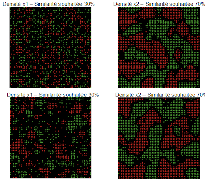 Un petit exemple peut être donné avec le modèle de ségrégation spatiale de Schilling. Imaginons que deux tribus les rouges et les verts se promènent dans un centre commercial et expriment des préférence pour être avec leurs semblables. Voici les configurations obtenues à partir d’une distribution au hasard pour 2 valeurs de deux paramètres (faible et forte densité de population d’une part, et d’autre part le souhait d’être entouré d’au moins 30% ou de 70% de voisins similaires). On voit que la densité et l’homophilie conduisent à une ségrégation forte. C’est un résultat classique.