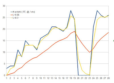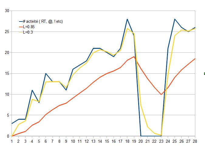 Une image valant pour beaucoup plus qu’un mot, voici ce que celà donne pour un twittos dont l’influence grandit de manière linéaire, et qui suspend tout activité pendant quelques périodes (il reprend ensuite au niveau où il s’est arrêté simplement en mobilisant à nouveau le réseau qu’il a accumulé) et pour deux valeurs du λ. La ligne en jaune colle à l’activité immédiate, celle en rouge atténue les aléas et “résiste” au creux de l’activité.