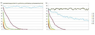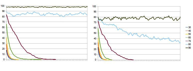 Mieux, on peut apprécier la satisfaction de ces usagers en calculant dans chacun des cas la proportion de ceux dont le nombre de voisins différents est supérieur à l’attente : en voici l’évolution au cours du temps pour les deux densités de population et 7 niveaux de préférences de similarités des voisins:
