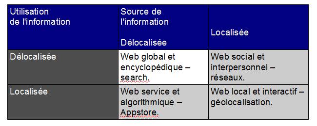 La dimension locale de l’internet se serait donc développée par de nouvelles populations d’utilisateurs, et l’accumulation des usages. Elle implique une transformation dans la localisation des sources d’information et de son usage. De ce double critère on en déduit une typologie des espaces internet. Si le premier aujourd’hui s’est largement structuré autour des moteurs de recherches, trois autres sont en plein développement. Le web social poursuit le développement de sa couverture et connait un nouvel essor avec les mobiles. Le web serviciel, moins médiatisé, poursuit lui aussi son développement. Un web local, voir hyperlocal,  est en train de se structurer autour des techniques de géolocalisation. De nouveaux espaces et de nouveaux modèles d’information qui se superposent.