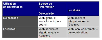 Avec le mobile c’est une autre population encore qui est atteinte : celle qui ici et maintenant, là où elle a besoin d’information sur ce là ou elle est. Et cette population cherche des horaires de trains, les heures d’ouvertures de la pharmacie de garde, une adresse, cherche à s’orienter..C’est l’usage de l’information qui à son tour est relocalisé. Le rôle des applis et des apps markets est essentiel. Leur usage s’appuie sur un principe de proximité, la géolocalisation est la clé de recherche. C’est un nouveau web qui prend le visage de l’environnement proche.