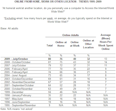 Mais il y a cependant quelques indications. A ce moment de l’histoire où le taux de pénétration de l’internet croit presque linéairement dans le monde pour arriver au stade où plus d’un tiers de la population mondiales est connecté, le modèle américain d’usage donne quelles indications. Si la pénétration de l’internet est de 80% toutes catégories d’usage confondus alors que 76% le sont à la maison, c’est qu’une part de ceux qui se connecte le font au travail ou ailleurs. On remarquera avec attention cet accroissement des autres lieux qui incluent sans doute les situations de mobilité - un taux de pénétration de 32% est enregistré, et surtout l’accroissement substantiel - il double en 10ans -  du temps passé sur les écrans.   A l’évidence chacun des lieux réclame une information différente pour des usages distincts. La diversification des usages en accroît le volume et la diffusion.