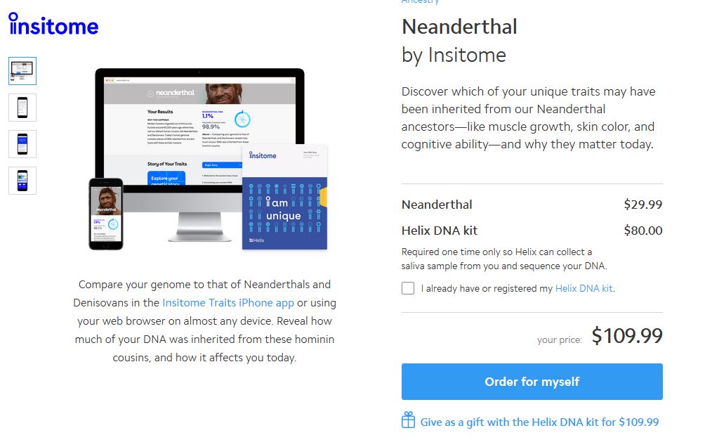 A la première analyse, cette offre - qui est tarifée normalement - à 80 $ pour le Kit Helix DNA, et 24 $ pour le test Neanderthal, est proposé par Isitome et le kit ADN par une autre entreprise évidemment dénommée Helix.