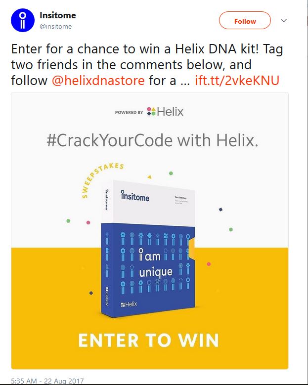De quoi s’agit-il? D’une offre de parrainage classique. Si vous retweetez cette offre en taguant l’image avec deux de vos amis, vous avez droit gratuitement au kit de séquençage génétique et de craquer votre code génétique.