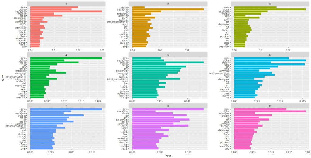 Le résultat principal est constitué par le diagramme suivant qui représente pour chaque topic ( on a choisit d’en identifier 9 de manière avouons le arbitraire - la question de la détermination du nombre optimum n’est pas encore résolue). Les valeurs sont les probabilités ( beta) que les termes soient associés aux topics. C’est une sorte de spectre lexical. Le topic 5, par exemple semble être relatifs aux chatbots, à l’IoT et à ses applications en marketing et dans les fintech.