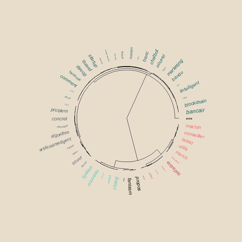 Voici le trail! On y lit plus clairement les sujet : on peut commençant en descendant à droite par un premier thème sur les chatbots et de Facebook naturellement qui se poursuit sur une thématique marketing et bancaire, les applications. Le troisième thème, en rouge est plus centré sur l’entreprise et l’organisation, l’impact sur les conseillers. Les thèmes du fantasme et du changement nécessaire s’enchaîne assez logiquement, un sixième thème se centre sur la résolution de problème, le dernier est relatif aux questions entrepreuneuriales et aux start-up.