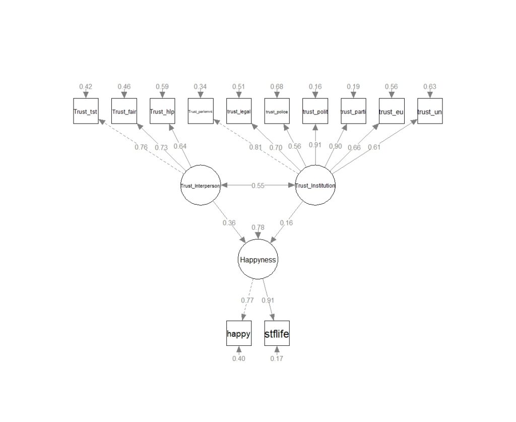 Le résultat du modèle est résumé dans le graphe suivant, il montre que le bonheur dépend plus de la confiance interpersonnelle, locale, de voisinage, de l’idée qu’on se fait de l’humain que de la confiance dans les institutions. Clairement deux fois plus. Si une unité de confiance interpersonnelle supplémentaire est obtenue, c’est 0,36 de bonheur gagné, le même gain de confiance envers les institutions s’accroît le bonheur que de 0,16 unités. La confiance reste un sentiment général, une corrélation de 0, 55 est enregistrée entre ses deux facettes, elles évoluent de manière conjointe ce qui se comprend : de bonnes institutions conduisent à ce que les gens se fassent confiance,, mais pour faire confiance aux institutions il faut aussi faire confiance aux gens qui les habitent.
