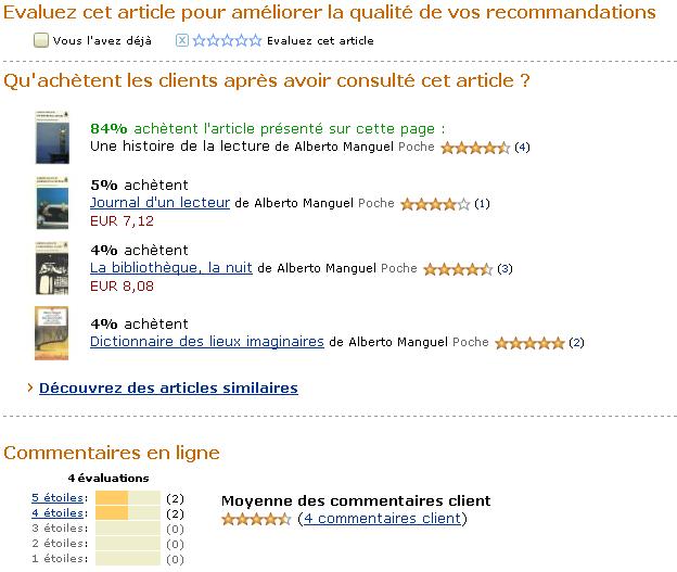 Le premier mécanisme demande peu d’effort et d’engagement, il induit par effet de sélection très certainement un biais de surestimation de l’appréciation générale, mais le nombre d’avis formulé vient nuancer : c’est moins la note moyenne qui compte que le nombre de réponses données. En voici un exemple issu d’Amazon.com. On appréciera le “84% des clients qui ont regardé cette page ont acheté l’article”, est-il un meilleur encouragement?